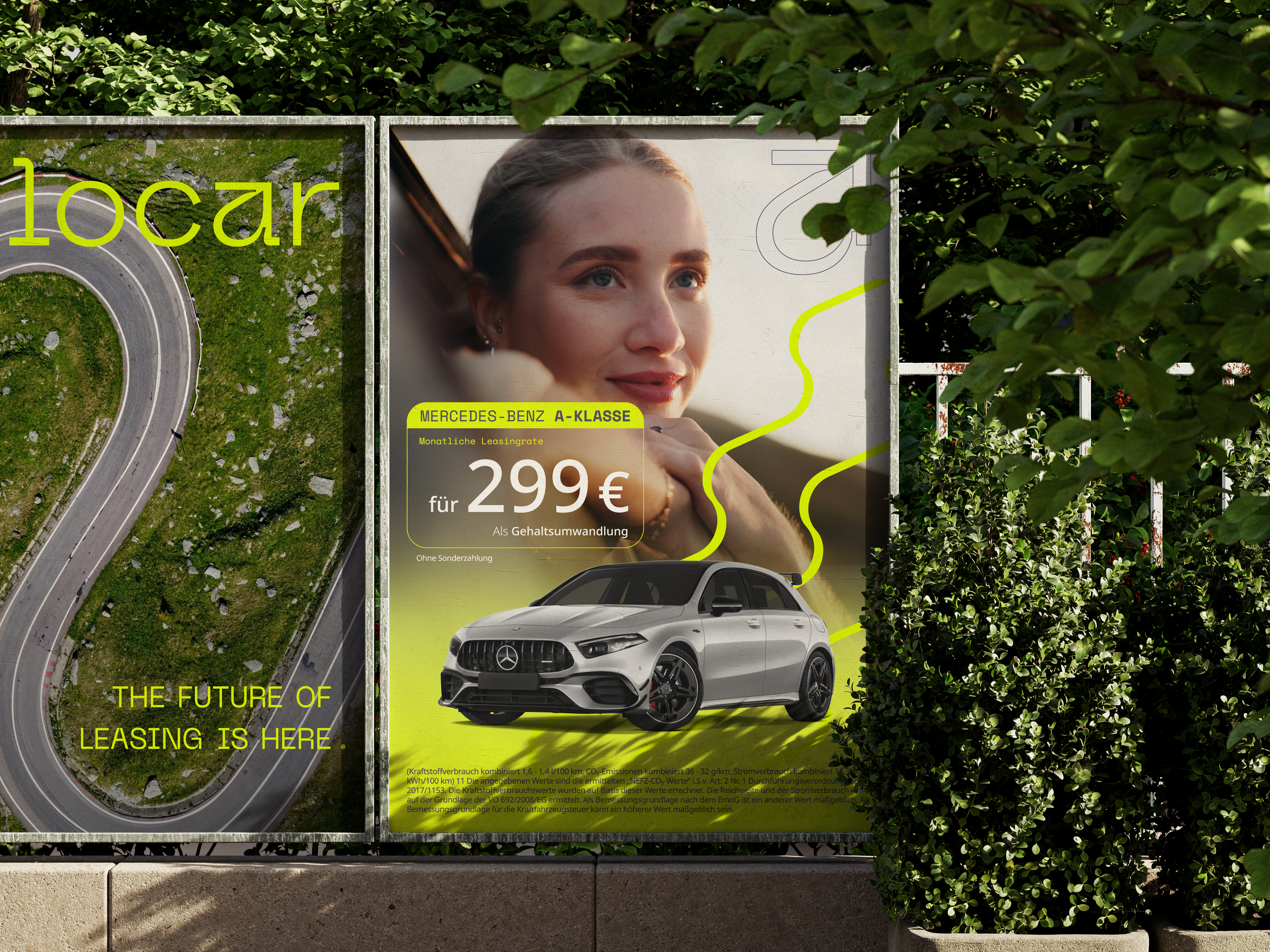 Wir entwickelten eine visuelle Identität, die so disruptiv ist wie das Geschäftsmodell selbst. Neongelb als Warnfarbe der Disruption, typografische Outlines statt massiver Blockbuchstaben, ein Claim, der keine Fragen offenlässt: „The future of leasing is here.“ Nicht morgen. Nicht irgendwann. Jetzt.